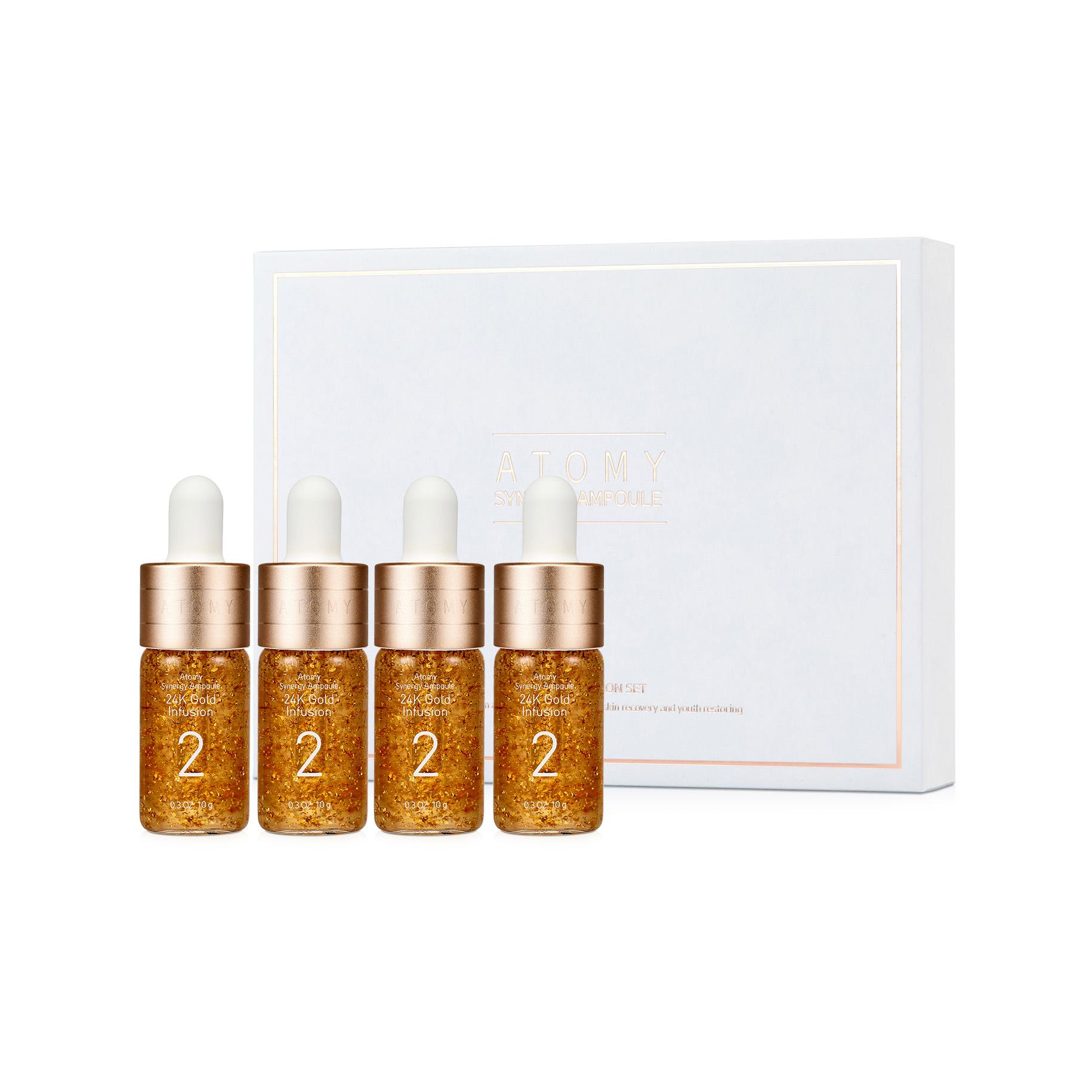 Атоми Набор синергетических ампул 24K Gold Infusion 1 шт (10 г4 шт) — это премиальный лифтинг-уход с 8-пептидным комплексом и 24-каратным золотом, который восстанавливает упругость кожи, сокращает морщины и придаёт сияние всего за 4 недели.